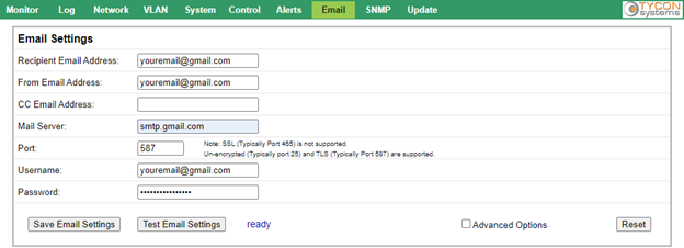 On the Email page of the TPDIN-SC48-20, enter the following: